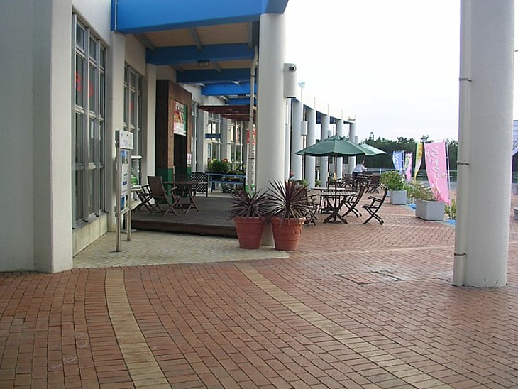 煉瓦タイルを敷き詰めたアプローチからメイン駅舎を。暖かな季節ならのんびり過ごせそうな場所だ。