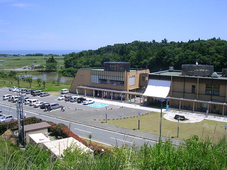 3.11の原発事故で閉鎖される以前に撮影したもので、現状とは異なる。西側の高台から見た駅舎。