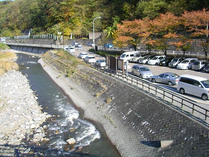 大きな木造の奈良井大橋から駅の駐車場を撮影。