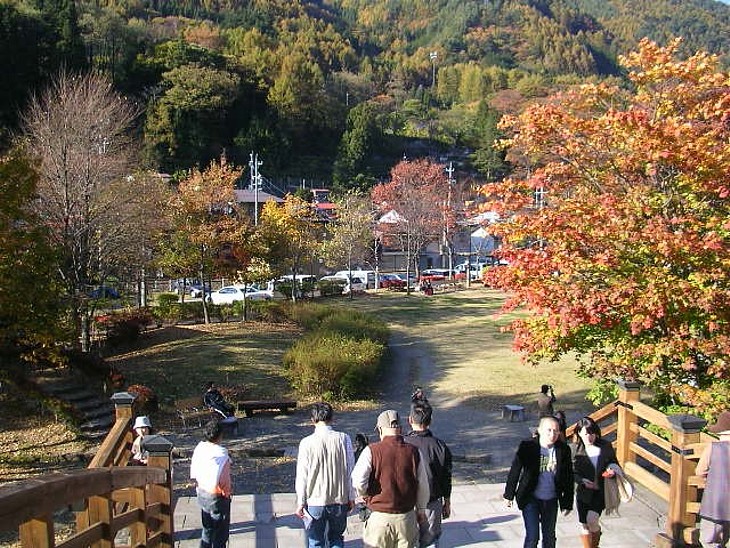 橋を渡り公園へ。正面の山裾が奈良井宿。