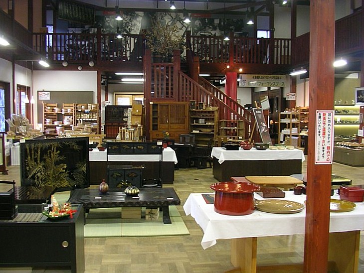 メインホールの木曽漆器展示コーナー。値段は高いが大型家具から小物まで多種多様、見るだけで溜息が出る。