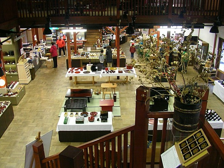 二階から木曽漆器展示コーナーを。値段は高いが大型家具から小物まで多種多様、見るだけで溜息が出る。