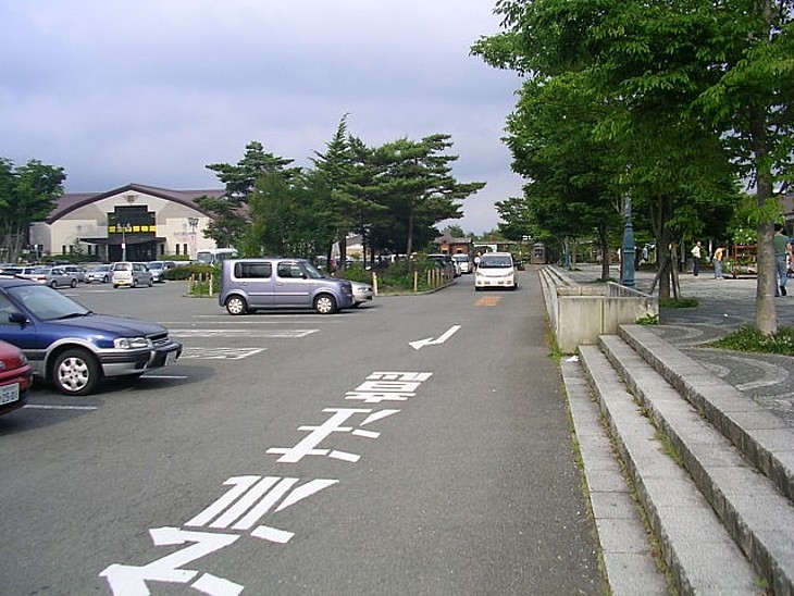 駅舎の前は博物館方向から時計回りの一方通行。駐車場は樹木で仕切られて使い勝手はやや悪い。