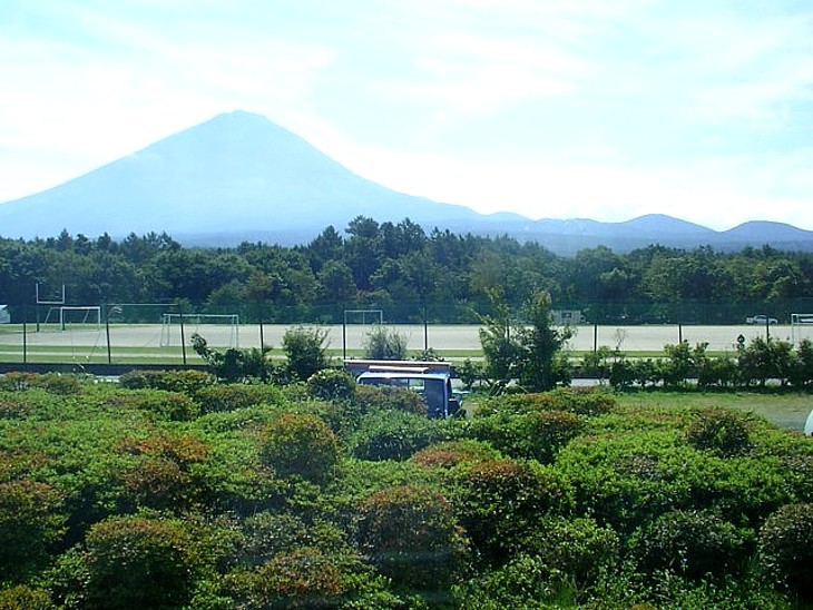 駅舎裏の村民専用温泉「鳴沢いきやりの湯」前から初夏の富士山を撮影。ここからの頂上は余り美しくない。