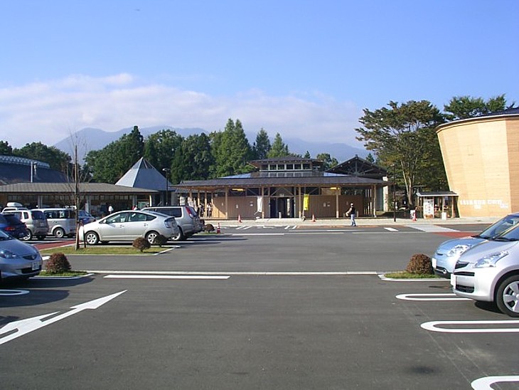 誘導路正面の大きな平屋が24時間トイレ、副通路も比較的広い巾を確保している。背景はなす茶臼岳の連山。