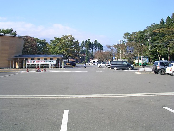 県道沿いにも駐車場がある。周辺はレストランや雑貨店が点在し避暑地の雰囲気に溢れている。