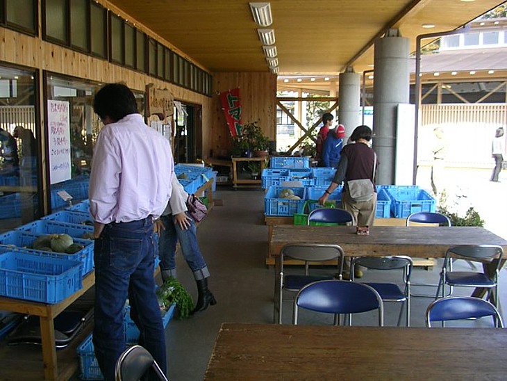 直売所の店頭には簡単な休憩コーナーも。買物袋を抱えたオバサンがちょっと一休みする感じ。