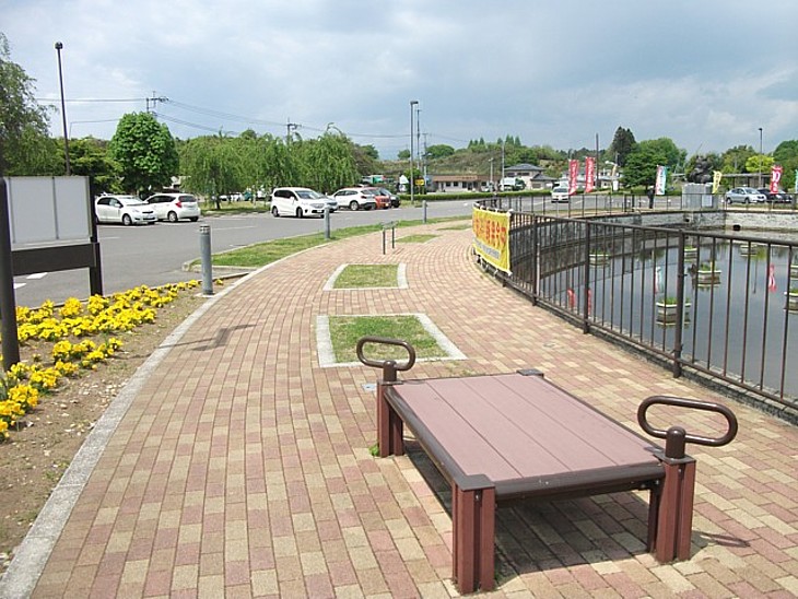 情報館から池を右に見て与一銅像に向かう遊歩道、雰囲気は良いが流れのない池の水質は悪い。