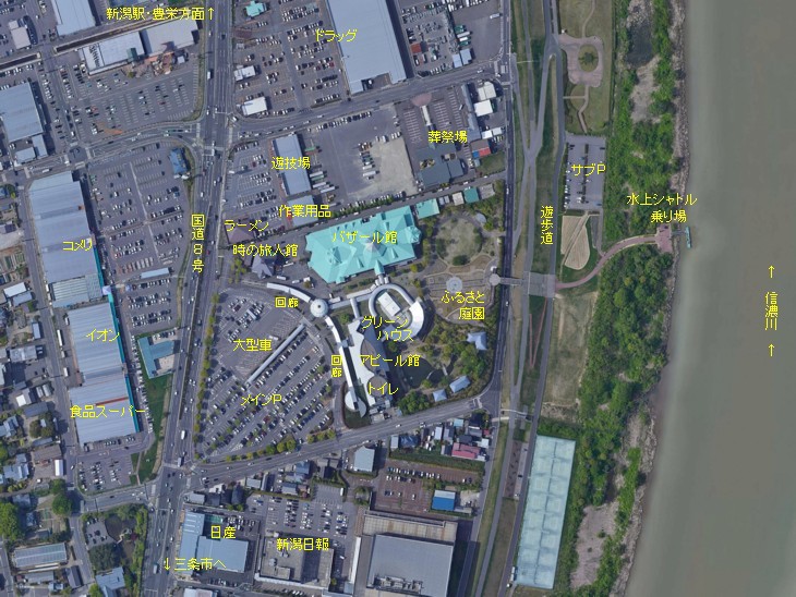 高速のSA並みの賑やかさだが混雑するのは昼間のみ、敷地の裏には信濃川の河川敷公園もある。