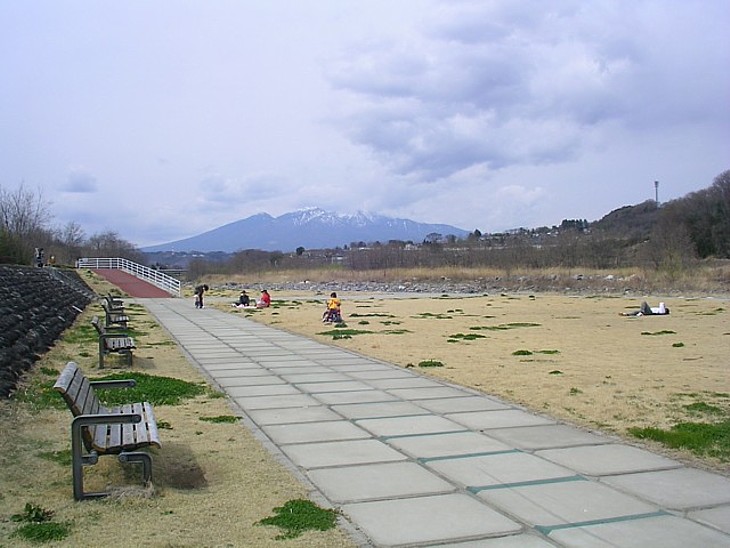 塩川の河川敷には良く整備された芝生公園が広がり、はるか上流には八ヶ岳連峰が見える。