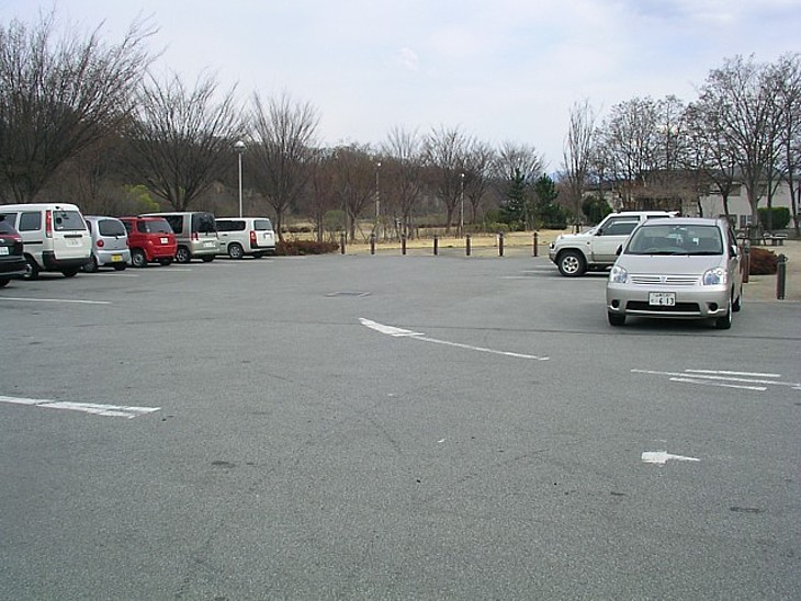 右奥、川に近い普通車用の駐車スペース。P泊向きでトイレは遠いが大型車による騒音の心配は少ない。