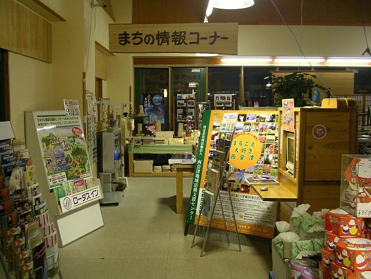 メイン駅舎左隅の「まちの情報コーナー」。ここでは西会津の観光や物産を紹介している。
