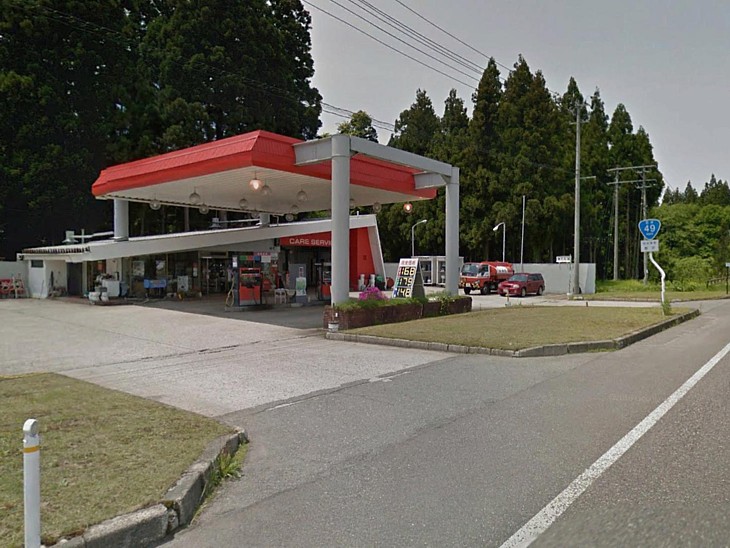 国道の筋向いにスタンドが2軒、約600m西にはコンビニと食品スーパーとコメリがある。