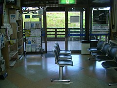 ホーム入口の待合室コーナーを利用している。連結イスが7脚ほどあり始発から終発(5:43〜22:18)までは利用できる。 | |
