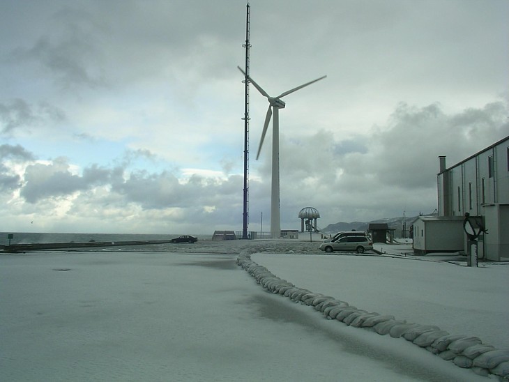 駅裏にある風力発電の塔と防波堤。ライトバンが停まっている業務用駐車場付近が最もP泊向きだ。