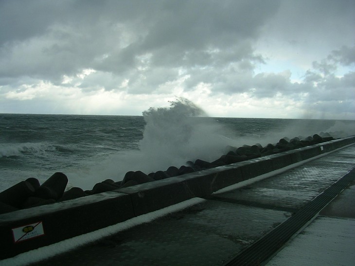 テトラポットに打ち寄せる冬の日本海。防波堤は東端の資料館から漁港まで約300m続いている。