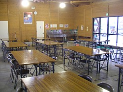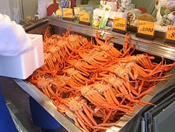 買ったカニを食べる「カニかに館」(9〜18時)が休憩室を兼ねる。他に軽食コーナー横にもテーブルと椅子が置いてある。 | |
