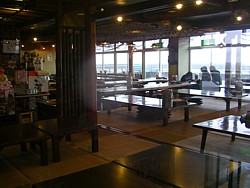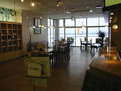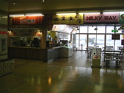 上記ミルキーウェイが軽食コーナーで、飲み物・ソフト・たこ焼きなどメニューはいろいろ。テーブル席が充分ある。 | |