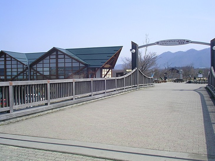 歩道橋から駅舎を撮影。直進して階段を下ると池や芝生が広がる公園に下る。右側の美術館は閉鎖された。
