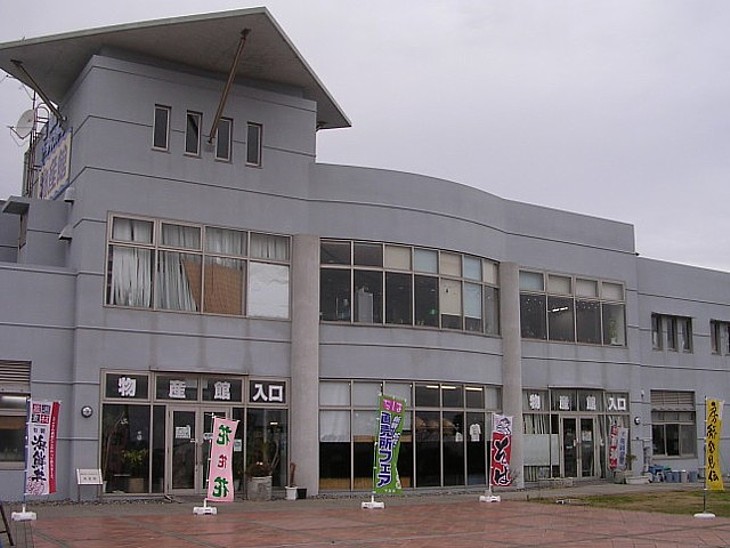 漁港側のサブ駐車場から駅舎を。漁民広場では第3と第5日曜の9〜16時にフリマを開いている。