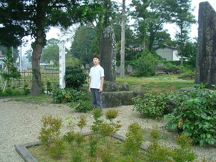 駅の近くにある小野小町の慰霊墓(場所を忘れた!)の前で。彼女は出羽郡司・小野良真の娘だったと伝わる。