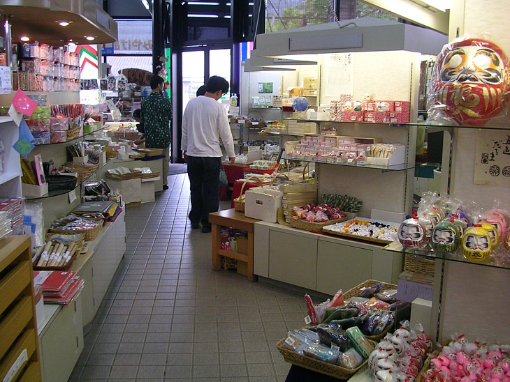 物販には和紙を使った民芸品が多く、通路も売り場も狭いためやや乱雑な印象がある。価格は高すぎる。