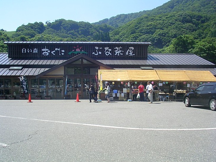 進入路の正面が物産館の「ぶな茶屋」。この日は初夏の日曜で客も多く、仮設テントの売店も忙しそうだった。