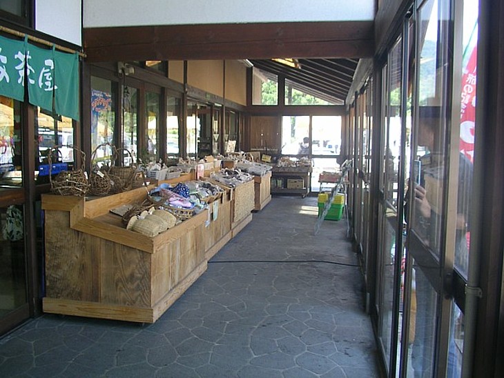 冬の冷気対策か、物産館「ぶな茶屋」の入口は風除室を兼ねる。民芸品や手編みの籠などを展示している。