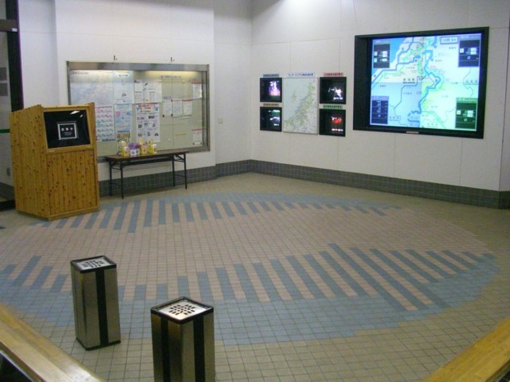 駅舎の左端がトイレ、その右が24時間利用できる広い休憩室と情報コーナー。汚さずに利用したい。