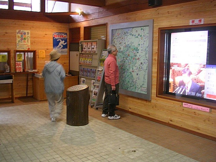 物産館の一角にタイル床の案内&休憩室。利用は営業時間中のみだが設備は整っており資料の種類も多い。
