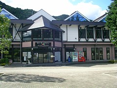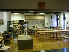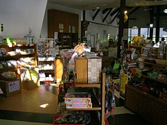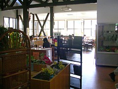階段下の展示コーナーに休憩室の機能がある。木工品が並んでいるため落ち着けないが...