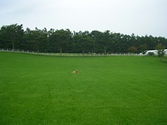 ノーリードで好きなだけ草地を走り回れるから犬にとっては天国だろう。北側にはリード付きの散歩ルートも延びている。 | |