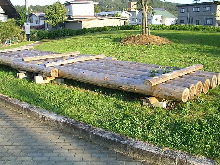 ドラマ「おしん」で、幼い主人公が両親と別れて最上川を下る。その筏の複製が草地に置かれていた。