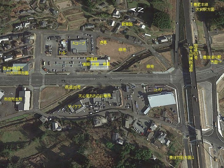 公共施設の多いエリアでAコープと広い緑地が隣接した落ち着ける駅。豊後大野って温泉が少ないんだね。