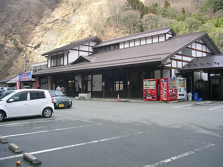 食事処の全景。自販機の右がトイレ棟に繋がる短い回廊部分、ここに狭い休憩スペースが設けられている。