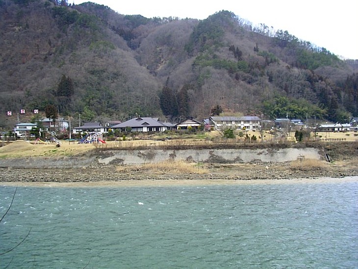 500m下流の対岸に「さぎり荘」が見える。ジンギスカンも良し、温泉を楽しんでから広い庭で遊んでも良し。