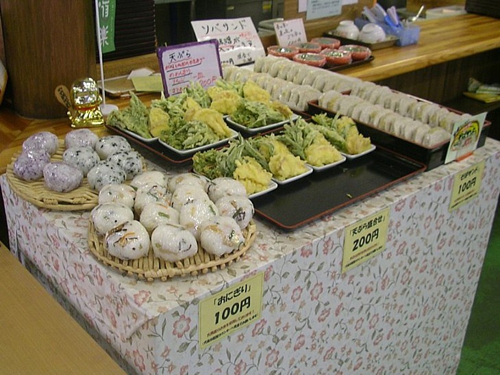 不揃いのお握りは100円、山菜の天ぷら200円、蕎麦サンド100円など。手軽に味わえる故郷の香りがする。