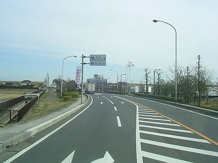 道の駅から埼玉大橋に向う県道。信号なしの片側一車線で道も広くはないが、右折車線は確保されている。