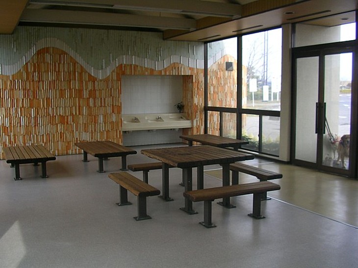 休憩室にはテーブル類の他に地図と水道だけ。地域紹介や案内などが皆無なのは実にもったいない、と思う。