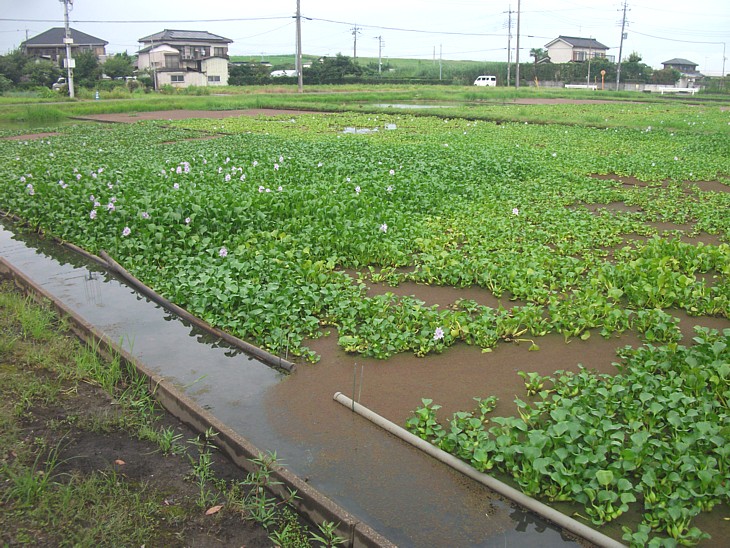 敷地横の休耕田に植え付けたホテイアオイ。画像は少し咲き始めた7月中旬に撮影したもの。