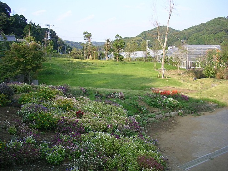 道路と農園の間に広がる花壇と緑地。もっと広いと楽しいが、民間経営の農園では非採算エリアか。