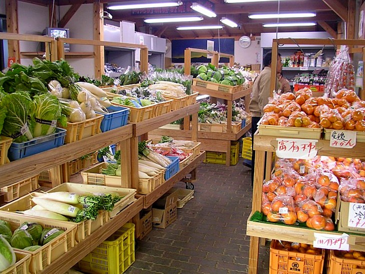 屋内の農産品売り場。野菜の多い季節の休日には屋外まで陳列が広がり、買い物客の人気を集めている。
