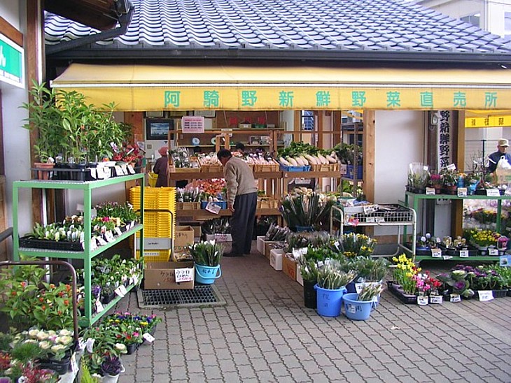 休憩コーナーの右が野菜直売所。暖かな季節には園芸鉢花も扱っており、商品はかなり豊富で価格も安い。