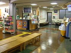 休憩コーナーのカウンターでソフトクリームなどを扱う。テーブルと椅子も置いてあり、雰囲気も悪くない。 |