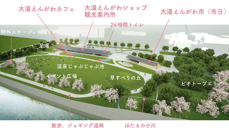 18年4月、広い緑地と共に開駅した大湯温泉の観光拠点施設。 画像にマウスオン→ 完成後の敷地全体のイラストへ。