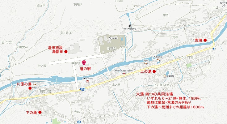 大湯川を隔てて国道103号を離れた裏道なので夜間の通過車両は少ない。大型車のスペースを離れればP泊に支障なし。 | |