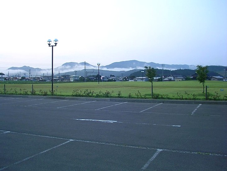 ホテル裏の芝は町民のグラウンド・ゴルフ用。犬は散歩禁止だがすぐ横にトイレがあり、P泊にも向いている。