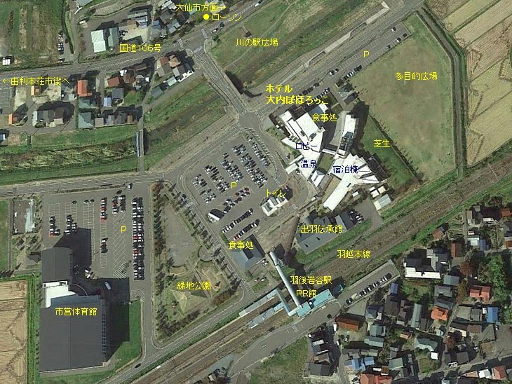 JR羽越本線の羽後岩谷駅に隣接した広い敷地にホテルや体育館を併設した、「鉄道の駅がある道の駅」だ。