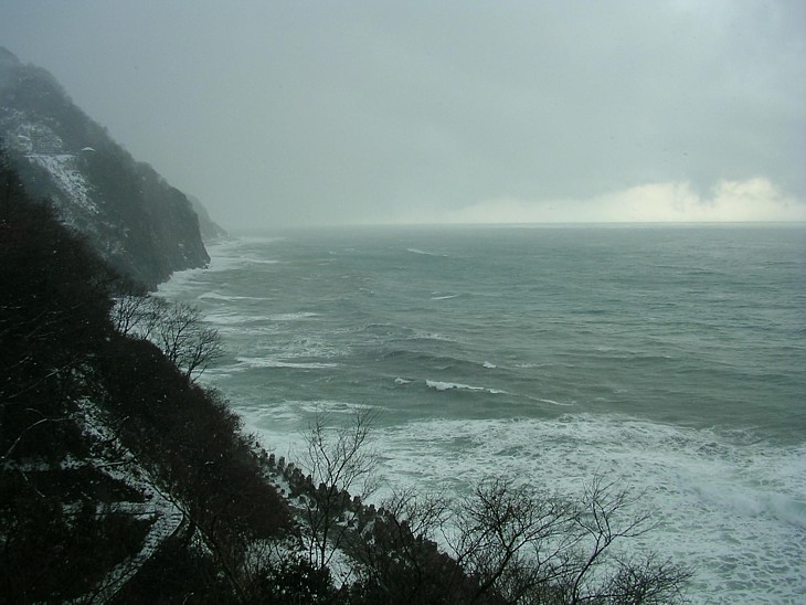 国道8号は展望台近くから急坂となって山腹を駆け上がり、スノーシェッドの中に消えていく。