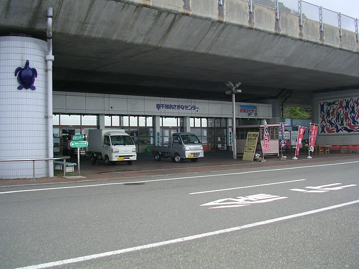 外見が殺風景な「親不知おさかなセンター」。地元の魚介類を並べているから新鮮さは保証付き。